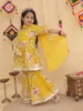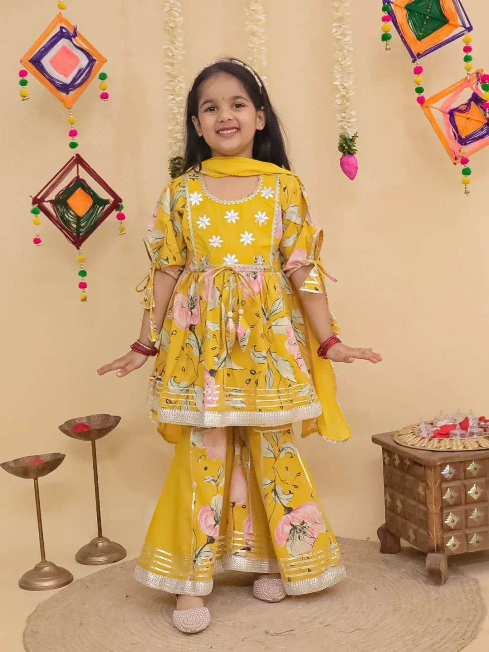 Pure 60*60 Cotton, floral printed, embroidered stylish Kurti with one balloon sleeves, round frilly hem Kurti with Gota lace embellishment and paired with Comfortable paneled Sharara pants with elastic waistband and chiffon dupatta with gota lace border
